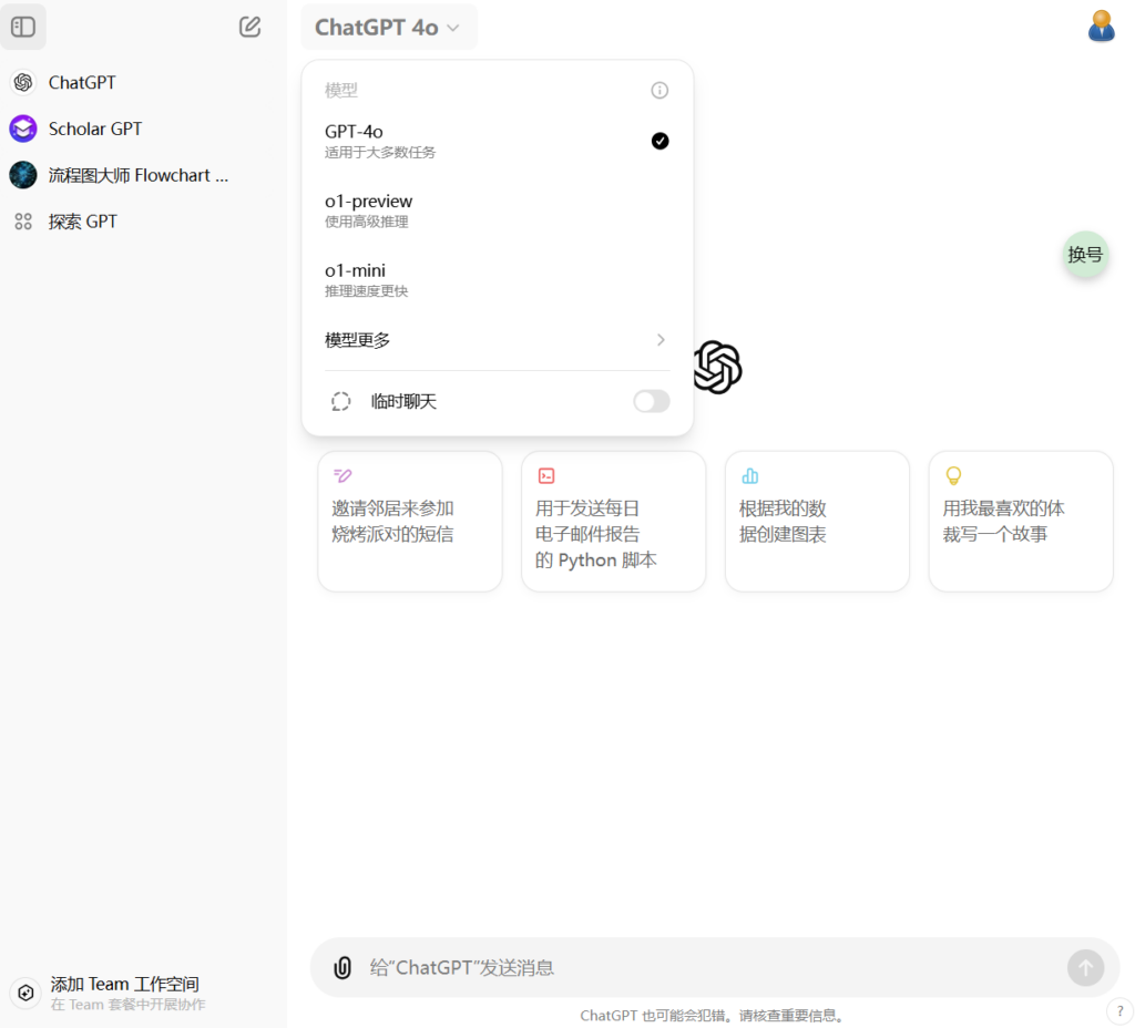 • 点击左上角的模型切换按钮,可以在 4.04o4o-minio1o1mini 模型之间自由切换。4o 是GPT的旗舰模型,具备更快的响应速度,改进的多语言支持和多模态多功能支持,综合使用体验是最好的。4.04o 相比,能力接近,但在处理复杂任务时表现更优,回复速度稍慢。4o-mini 是一个小型模型,前身为3.5模型,能力表现较弱,不推荐使用。而 o1o1mini 是新推出的纯文本模型,响应速度慢,专注于复杂的推理任务,尤其擅长编码和数学问题。